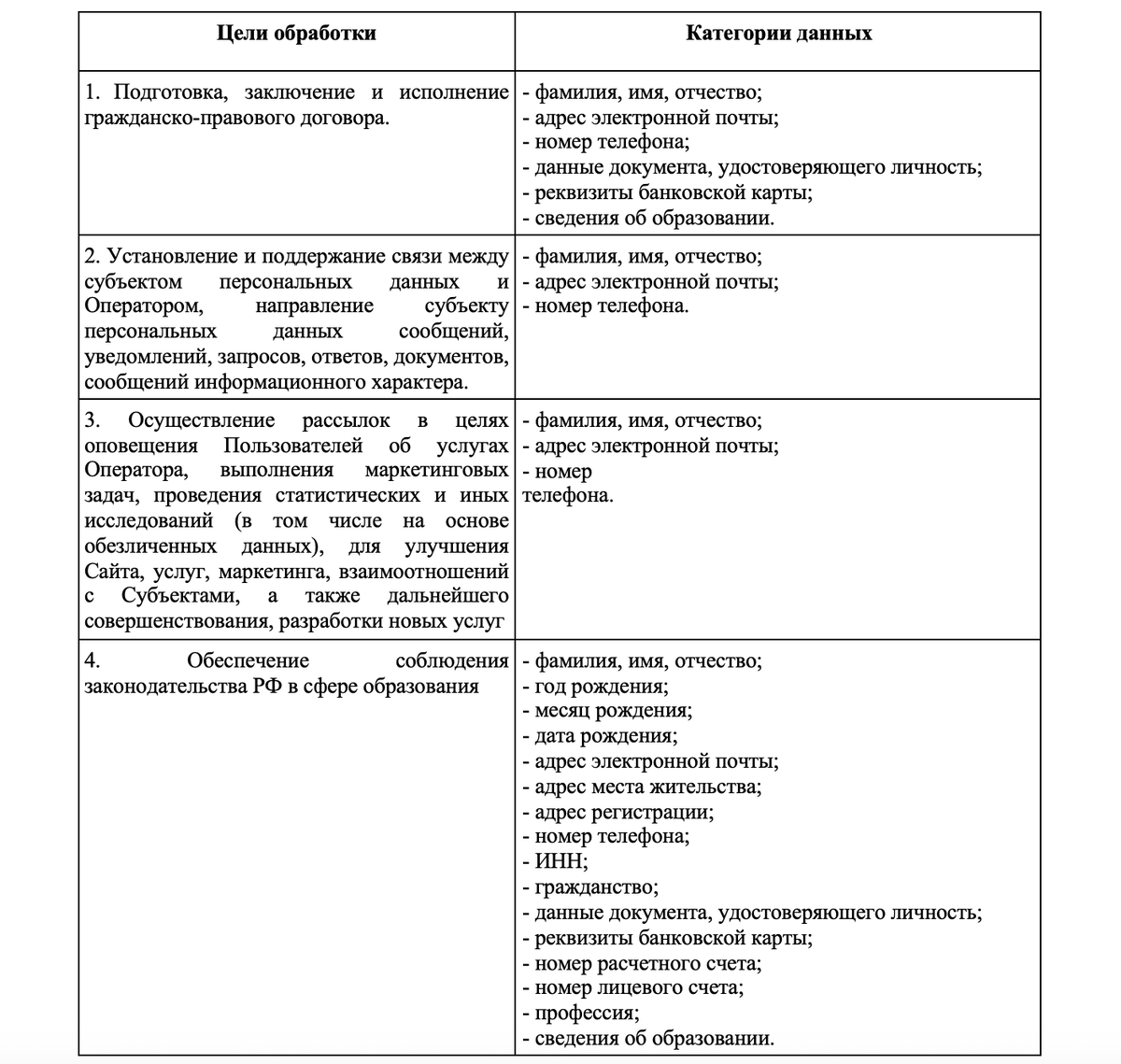 2. Согласие дается на обработку следующих категорий персональных данных в заранее определенных и законных целях:
